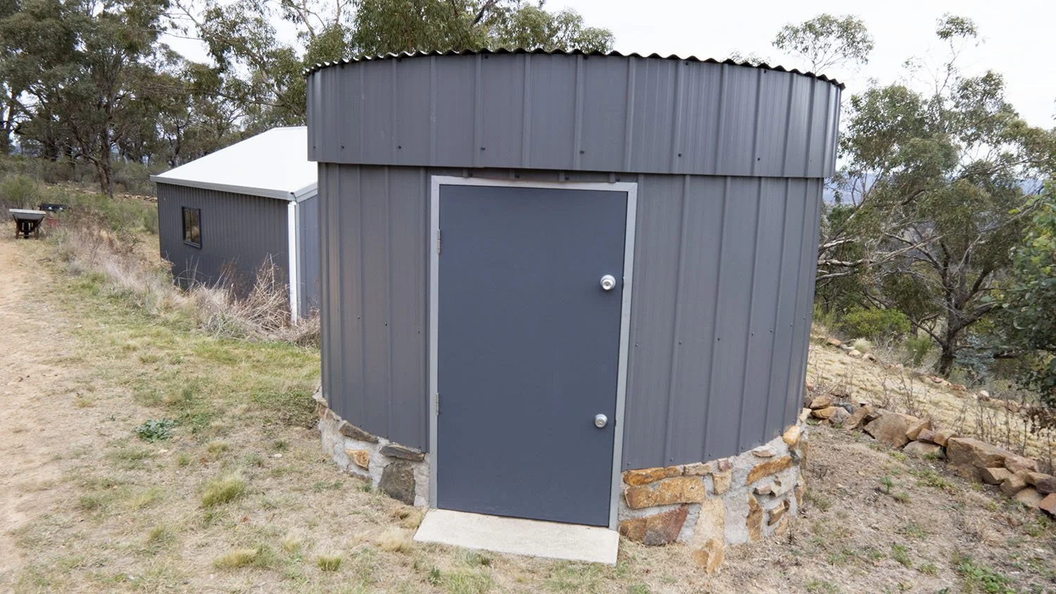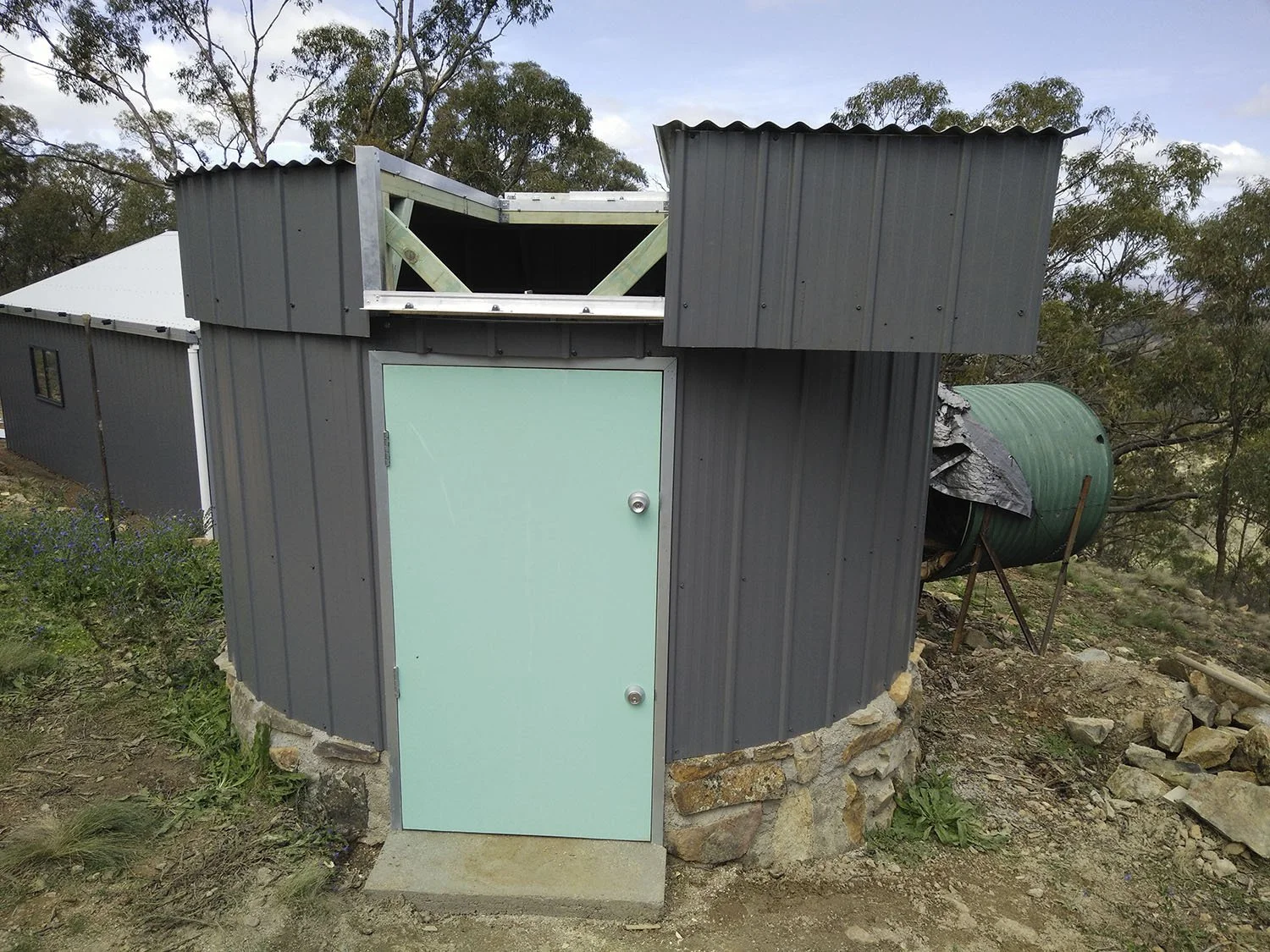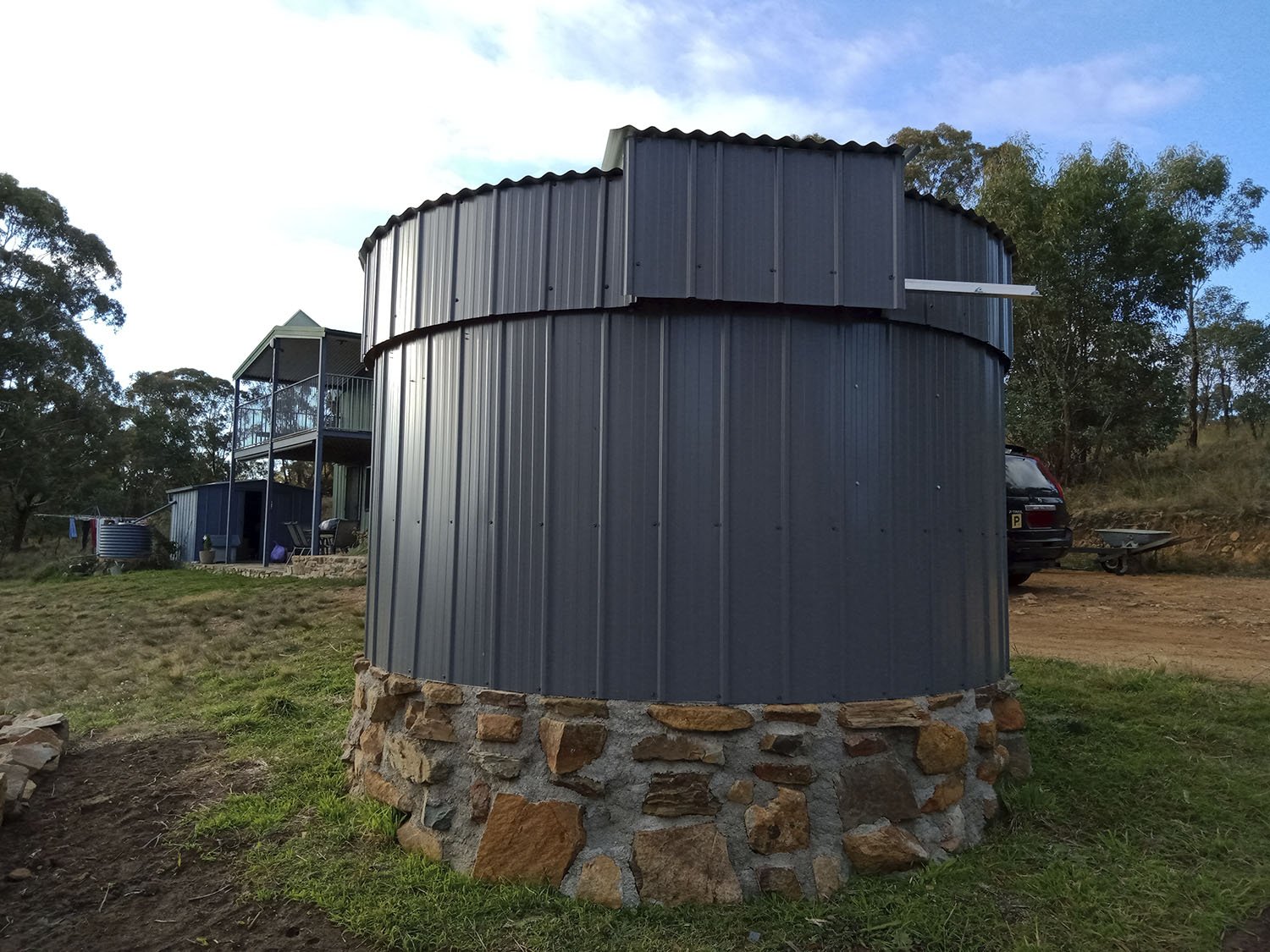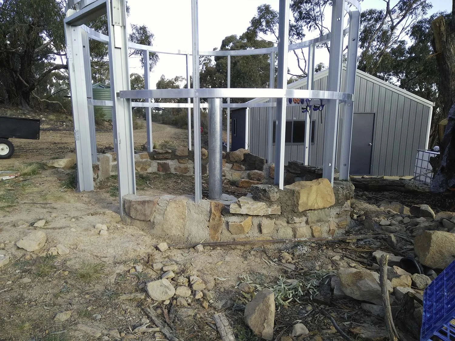 The design of my observatory represents my budget and location. Looking at the price of a fully automated three metre dome observatory was an intimidating factor. My location on top of a ridge in the middle of the surrounding bush lands in a high fire risk area was another major factor. I decided to construct the observatory from stone that I have in abundance on my property to keep construction costs low. I used iron to protect from an amber attack as a plastic or fibreglass dome would not be as fire resistant. The high wind speeds we have at this elevation was the main reason I decided to not build a roll of roof observatory even though this was the simplest and my preferred choice. Having the protection of a roof while observing and photographing meant that the telescope was not being effected as much by the wind.