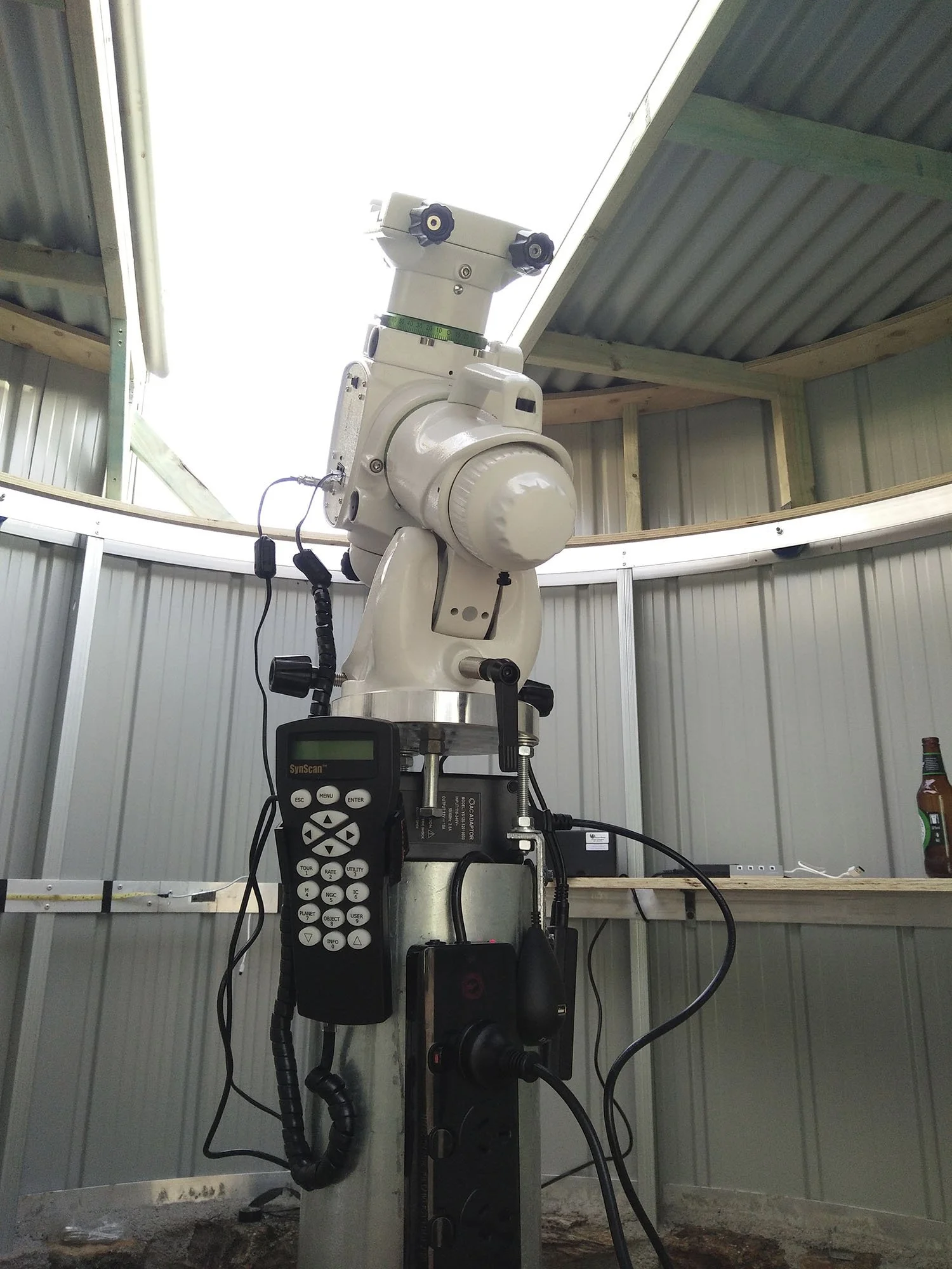 Unfortunately this decision also meant a challenge for me to automate the roof as I could not just simply roll it off, instead the observatory roof has to track with the telescope. I have managed to automate the observatory roof with the tracking of the telescope by utilising laser sensors. I have been fortunate to have an interest in electronics from a young age and I have been employed as a technician in the entertainment industry for most of my life. This has armed me with the knowledge necessary to undertake the challenge mechanically and electrically.