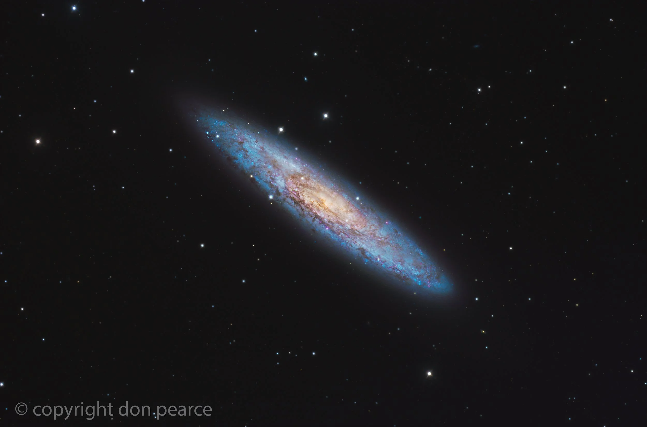 Also known as the Sculptor Galaxy, located about 11.5 million light-years away is a spiral galaxy located in the constellation of Sculptor. The galaxy has a distinctive shape, with its elongated central region and sweeping spiral arms. NGC 253 has a high rate of star formation, which is evident from the numerous bright stellar nurseries dotting its arms. The Sculptor Galaxy having an active galactic nucleus, fuelling a supermassive black hole at its centre.